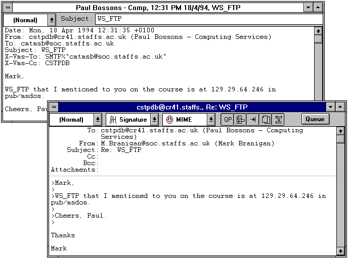 ld of the header. The original sender's text is also automatically included at the beginning of the reply message (prefixed by ">" at the beginning of each line). This text may be edited or deleted as needed. Additional text can be added to the reply j