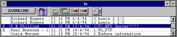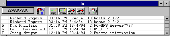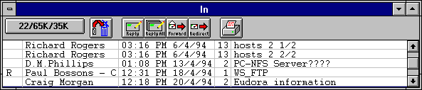 An incoming message for which the Reply command has been used is identified by an R in its message summary.