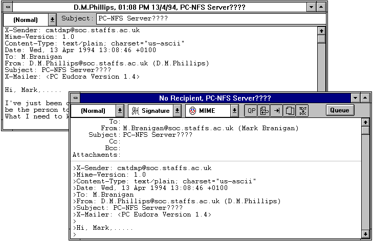 e header. The address in the From: field is that of the person who originally sent the message, by way of your address. In addition, there are no ">" markers at the beginning of each line of the original text. However, you may edit or add more t