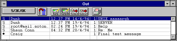If you now close the message (by clicking the close box in the upper left-hand corner of the me ssage window, or by selecting Close from the File menu), it can be re-opened from the Out mailbox for further changes. As with any message summary listed in a mailbox window, it can be identified by the contents of its To: and Subject: field. A bullet (o), in the far left column of a message summary listed in the Out mailbox indicates that the message is being indefinitely held there and is queueable. Such messages remain in the Out mailbox until they are queued and sent or deleted.