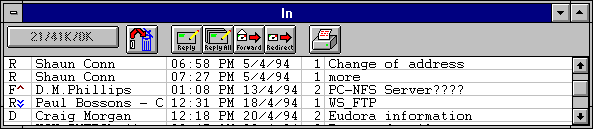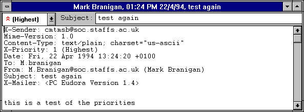 Note: All new messages are created with Normal priority, even replies to messages whose priority you have changed. The exception to this is that, if the sender of a message gives it a priority other than normal, Eudora insists on giving your reply the same priority. This occurs e ven if you reassign the priority of the sender's message after you have received it. You can, however, change the priority of your response by re-assigning it manually.