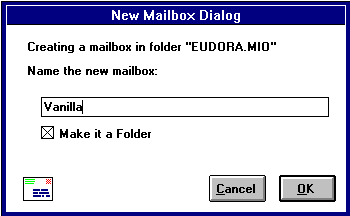 To create a new mail folder select New... from the Mailbox menu. The New Mailbox dialog is displayed. Type the name of the new mail folder and check the Make it a Folder option. Click OK to create the folder.
